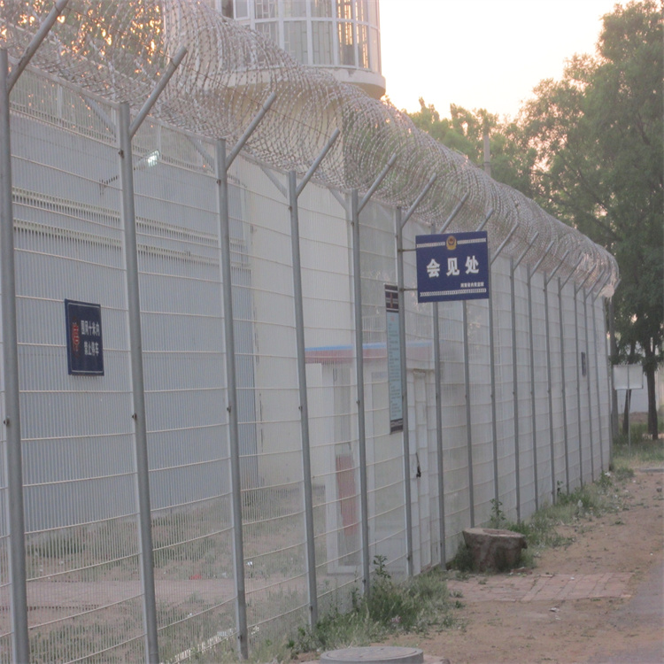 形刀刺網(wǎng)固定在鋼網(wǎng)墻頂部,從而有效的增加監(jiān)獄鋼網(wǎng)墻的防攀爬性和安全性。V型支架加裝防拆卸刀刺網(wǎng)。刀刺網(wǎng)的直徑-般為