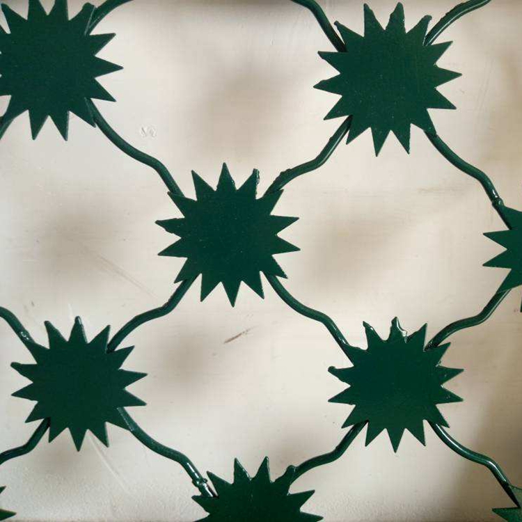 監(jiān)獄梅花刺網(wǎng)防攀爬能力強(qiáng)主要是因?yàn)樗忻坊ㄐ螤畹拇蹋柣ㄐ螤钤O(shè)計(jì)此設(shè)計(jì)不僅美觀大方,而且具有極強(qiáng)的防護(hù)力。太陽花防護(hù)網(wǎng)中每個(gè)花瓣都是由網(wǎng)的橫、豎兩根主鋼筋相交截割制成,花心及花干部分則為輔助鋼筋固定,將網(wǎng)格尺寸調(diào)整、加強(qiáng)牢固。因?yàn)閲娝艿乃軐颖容^薄,不會形象梅花刺的形狀,從而達(dá)到防攀爬效果。