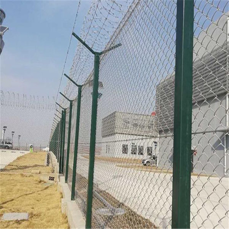 鋁包鋼絲機(jī)場(chǎng)圍界網(wǎng)孔一般為50*50mm,絲徑5mm,頂部可搭配有V字叉和刀刺滾籠以加強(qiáng)防護(hù)能力。它還有一個(gè)優(yōu)