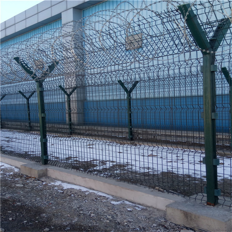 在監(jiān)獄內(nèi)距離獄墻外5m處設(shè)置防攀爬金屬隔離網(wǎng)。根據(jù)防攀爬獄墻隔離網(wǎng)的設(shè)計要求,采用立式Y(jié)式型柱、鋼絲網(wǎng)加蛇腹型刀刺網(wǎng)。