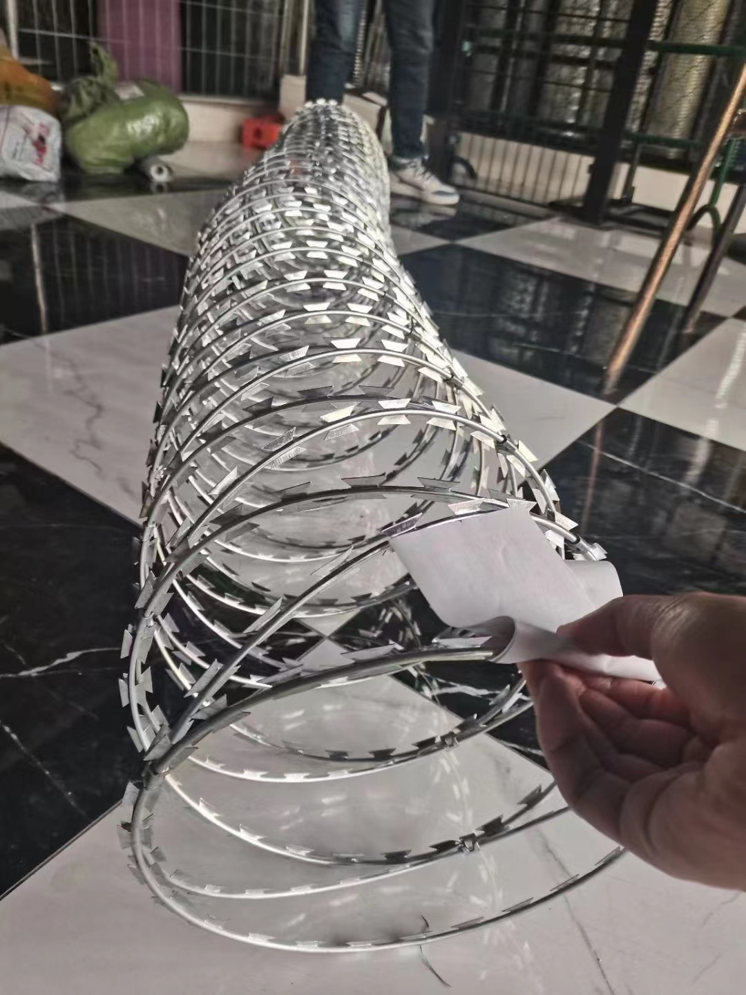 據(jù)了解,這種刀片刺繩也稱為刺絲滾籠、刀片刺網(wǎng),是一種新型的防護(hù)網(wǎng)。