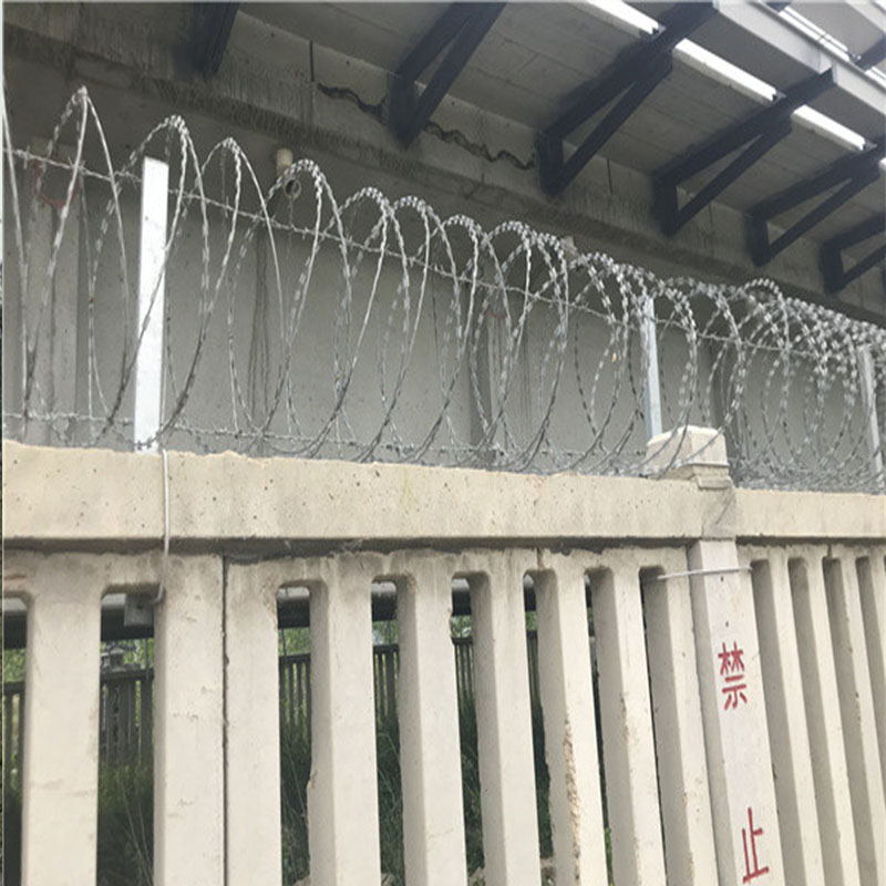 刀刺滾籠生產(chǎn)工藝 :刀片刺繩由熱鍍鋅板或不銹鋼薄板沖壓出尖銳的刀片狀,高張力鍍鋅鋼絲或者不銹鋼絲做芯線組合而成的防護產(chǎn)品,利用不銹鋼卡扣將刀片刺繩繞圈后相臨兩圈每隔120°用刺絲連接卡固定,張開后形成蛇腹網(wǎng)狀,閉合后刀片刺繩 圈徑為50cm,張開后每交叉圈安裝間距20cm,直徑不小于45cm。由于刺網(wǎng)造形獨特不易觸摸、形成立體圍護因而能達到極好的防護隔離效果,該產(chǎn)品具有嚇阻效果好、美觀、施工便利、線型可隨地勢變換、經(jīng)濟實用等優(yōu)異特點。