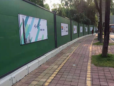圍擋基腳采用M10水泥砂漿砌筑MU10頁巖磚磚砌0.5*0.5的基礎(chǔ),用于增強(qiáng)圍擋抗風(fēng)穩(wěn)定性;pvc圍擋設(shè)2.5米高,寬3米為一板。施工圍擋做美化處理,噴涂企業(yè)名稱、安全、質(zhì)量、文明施工用語及開發(fā)項(xiàng)目商業(yè)廣告,嚴(yán)禁張貼、涂寫垃圾廣告。