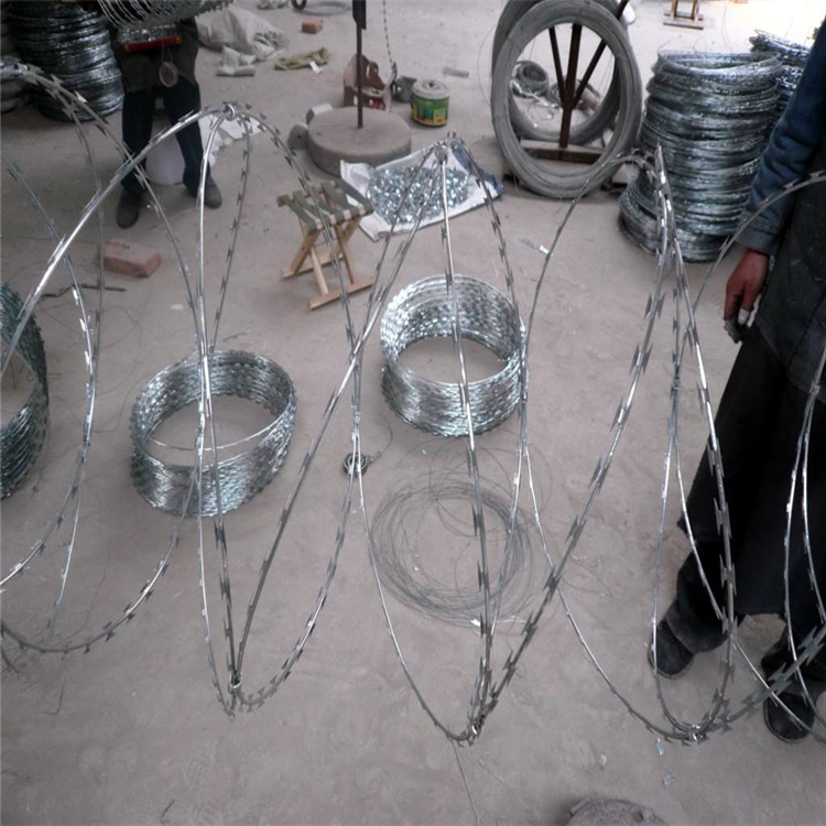 3、鍍鋅刺刀圈材料及安裝技術(shù)要求:鍍鋅刺刀圈材料:常用刀片刺網(wǎng)規(guī)格為BTO-22,刺圈直徑500mm,刀片長(zhǎng)度22mm,刀片寬度15mm,刀片間距34mm,鍍鋅噴塑。鍍鋅刺刀圈規(guī)格為雙股2mm鐵絲捻扎而成,刺結(jié)間距102mm,鍍鋅防腐。鍍鋅刺刀圈安裝應(yīng)控制在每米圍界范圍內(nèi)有5個(gè)刺圈,即刺圈安裝間距20Omm,要求刀刺圈間距均勻,上下口平直。刺刀圈固定件為專用卡扣,使用專用工具固定在鋼圍界刺繩上,卡扣不得有松動(dòng)現(xiàn)象,保證刺網(wǎng)安裝牢固。