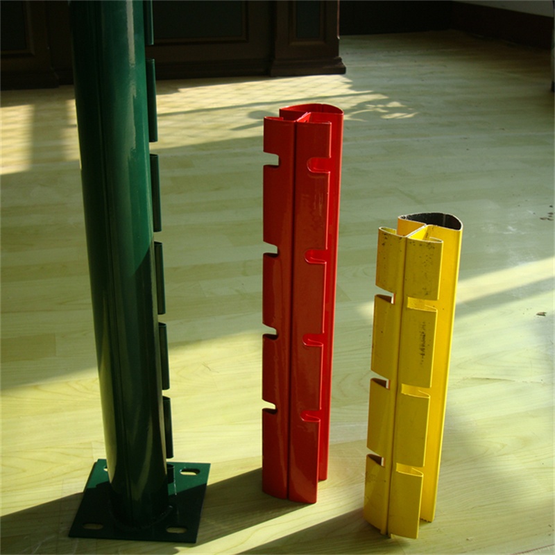 立柱的結(jié)構(gòu)描述:一般桃形立柱的板材厚度為1-1.2mm,通過機器冷壓、冷彎成型。柱體外側(cè)為橢圓型,內(nèi)側(cè)兩板相接后均各自向外彎制成U型,即為掛鉤部分。為便于桃型立柱與網(wǎng)片的連接,立柱內(nèi)側(cè)根據(jù)網(wǎng)片的網(wǎng)孔尺寸,延立柱長度方向均勻的設(shè)置N組鉤掛缺口分布于柱體兩側(cè),掛鉤U型的外部與外側(cè)的橢圓形柱體的直邊相切,有效地防止被撬開,保證了護(hù)欄的防撬安全性能。