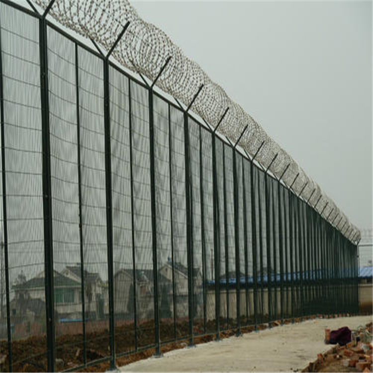 監(jiān)獄防爬鋼圍網(wǎng)V型支架加裝防拆卸刀刺網(wǎng)。刀刺網(wǎng)的直徑一般為500mm、600mm、800mm,材質(zhì)均為優(yōu)質(zhì)304不銹鋼,鎳含量8個以上。刺網(wǎng)芯線直徑為2.5mm、刀片長22mm,刀片寬度15mm,刀片厚度0.5mm。蛇腹形刀刺網(wǎng)的排列密度不小于16圈/米,相鄰每圈間距不大于120mm。監(jiān)獄用的刀刺網(wǎng)通??壑g的距離是120mm,直徑500mm的刀刺網(wǎng),覆蓋一米的重量約為2.38公斤(其他直徑的覆蓋長度可以詳細詢問安平縣艾瑞金屬絲網(wǎng)有限公司業(yè)務(wù)部,向您詳細解答)。