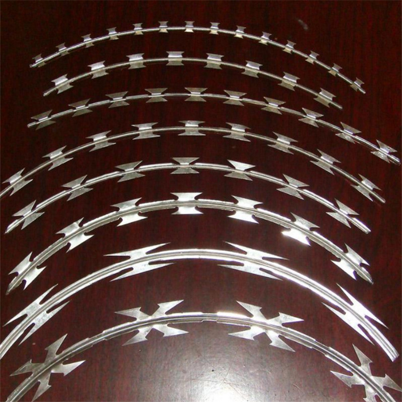 螺旋單一型刀片刺繩是由一根蛇腹型刀片刺繩環(huán)繞而成,不需要使用卡子來固定,按照其展開的自然形式進(jìn)行安裝。是刀片刺繩布置的一種,它沿墻壁或柵欄自然環(huán)繞來達(dá)到防護(hù)目的。選用優(yōu)質(zhì)低碳鋼絲,鍍鋅、涂塑、噴塑。特點是網(wǎng)身剛硬,不必用張力絲、不需要高技術(shù)工人維護(hù)、易安裝、維護(hù)成本低。主要用于軍事重地、監(jiān)獄、機(jī)關(guān)、銀行,以及生活小區(qū)圍墻、私人住宅、別墅的圍墻、門窗、高速公路、鐵路護(hù)欄以及邊境線等用來防護(hù)保安。