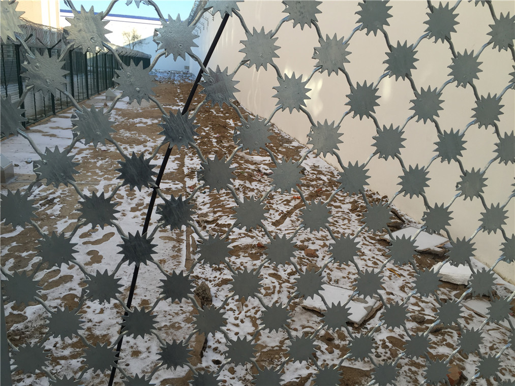 1、梅花刺片:梅花刺片直徑不小于7.0cm(直徑6cm、7cm、8cm),刺片厚1.2mm,采用Q235低碳鋼板沖壓成型。梅花刺片用氬弧焊將梅花形刺片焊接在美格網(wǎng)的節(jié)點(diǎn)上,形成刺形保護(hù),有效的防止了手握腳攀。