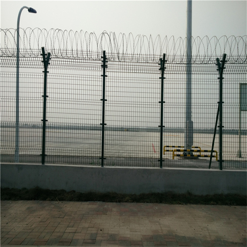 機(jī)場(chǎng)鋼筋圍界網(wǎng)頂部加裝刀片刺絲、刀片刺網(wǎng)后又很好的增強(qiáng)了安全防護(hù)性能。采用電鍍、熱鍍、噴塑、浸塑等防腐形式,具有很好的抗老化、抗曬、耐腐蝕等特點(diǎn)。其產(chǎn)品造型美觀、花色多樣,既起到圍欄作用,又起到美化作用。由于具有安全性高、防攀爬能力好,網(wǎng)片連接方式采用特制SBS緊扣件,有效防止人為的破壞性拆卸,橫向四道折彎加強(qiáng)筋,使網(wǎng)面強(qiáng)度顯著增加。