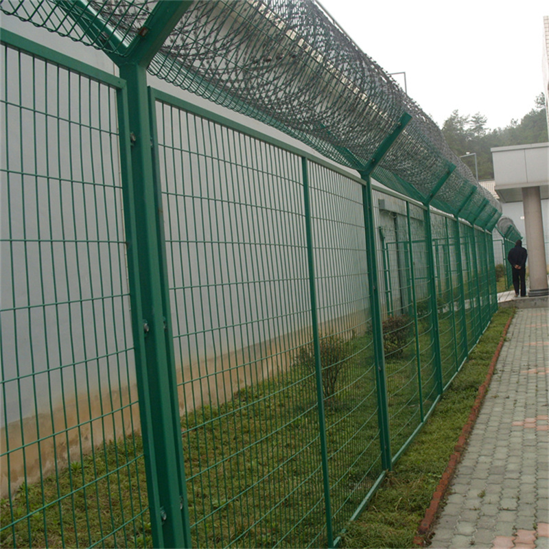 監(jiān)獄金屬鋼網(wǎng)墻的頂部應(yīng)設(shè)一道蛇腹型刀刺網(wǎng),蛇腹型刀刺網(wǎng)材質(zhì)宜為304不銹鋼,圈徑宜為600mm,每米長度不應(yīng)少于7圈,圈距排列應(yīng)均勻,刀片形式宜為BTO-22(芯線直徑2.5mm±0.1mm,刀片厚0.5mm±0.05mm,刀片長22mm±1mm,刀片寬15mm±1mm,刀片間距36mm±1mm),用于支撐刀刺網(wǎng)的支架伸出刀刺網(wǎng)長度不應(yīng)大于50mm,隔離網(wǎng)宜采用“熱鍍鋅+表面噴涂”雙重防腐處理,設(shè)計耐腐蝕年限不應(yīng)少于10年。