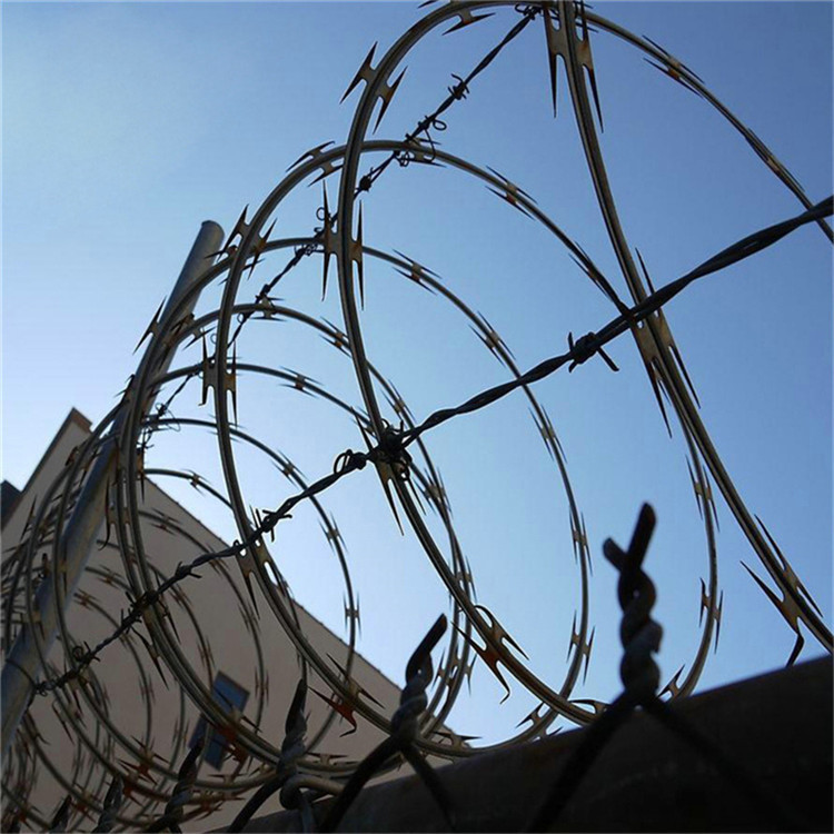 監(jiān)獄看守所蛇腹式刀刺網(wǎng)材料有中碳鋼絲、冷軋鍍鋅薄板,不銹鋼板,不銹鋼絲。蛇腹型刀片刺網(wǎng),上、下懸掛0.5米的交叉蛇腹型刀片刺網(wǎng),刀片刺網(wǎng)采用鋼板沖壓成型包附于鋼絲(筋絲)之上,由銳利尖角鋅鋼板或不銹鋼薄板做刀片,高張力鋼絲做芯線組合而成的。鋒利的刀型刺由雙線扣裝后成蛇腹?fàn)罴让烙^又讓人不寒而粟。起到了很好的阻嚇作用。刀片刺網(wǎng)硬度好,制造及特點(diǎn):鋼絲為芯絲,將沖壓好的刀片包裹在芯絲上,一次制成。產(chǎn)品具有很強(qiáng)的防護(hù)能力和恐嚇能力,安裝方便,壽命長(zhǎng)。