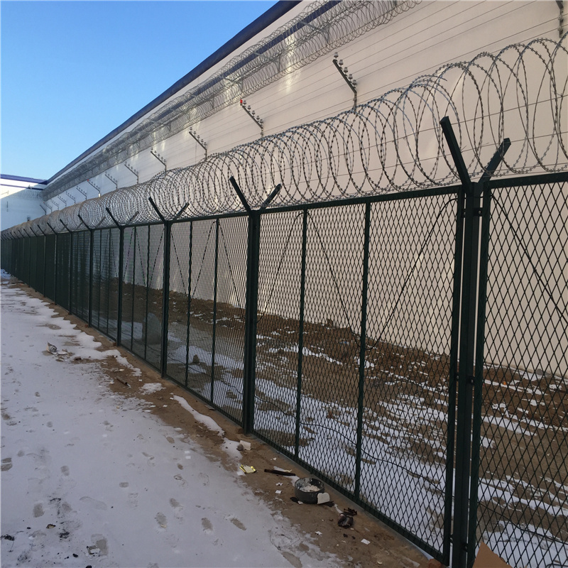 監(jiān)獄鋼網(wǎng)墻一般帶有邊框,邊框尺寸一般為20*30mm、30*40mm、30*50mm等等,邊框增強(qiáng)了鋼網(wǎng)墻的牢固性。鋼筋焊接鋼網(wǎng)墻的立柱一般采用60*60/80*80/100*100等的方形鋼管焊接而成,厚度采用3mm以上能夠有更好的牢固作用。防攀爬是監(jiān)獄鋼網(wǎng)墻必須必備的特點(diǎn),我們一般會(huì)在監(jiān)獄鋼網(wǎng)墻頂端架設(shè)蛇腹形刀刺網(wǎng)?,F(xiàn)在監(jiān)獄架設(shè)的蛇腹形刀刺網(wǎng)型號(hào)為BTO-22型號(hào),根據(jù)規(guī)定不同的地方架設(shè)的刀刺網(wǎng)圈經(jīng)不一樣,一般有φ50cm、φ60cm、φ80cm。