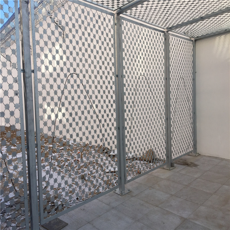監(jiān)獄梅花刺鋼網(wǎng)墻又稱監(jiān)獄護(hù)欄網(wǎng)或監(jiān)獄隔離柵,主要是采用高強(qiáng)度的刀片刺網(wǎng)與普通防護(hù)網(wǎng)的結(jié)合,由V型支架立拄,加強(qiáng)型焊接片網(wǎng),安全防盜連接件和刀片刺網(wǎng)組成。刀片刺網(wǎng)是一種新型防護(hù)網(wǎng),由銳利尖角鍍鋅鋼板或不銹鋼薄板做刀片,鋼絲做芯線組合而成的防護(hù)器材梅花刺網(wǎng)又稱高安全防護(hù)網(wǎng)、監(jiān)獄防護(hù)網(wǎng),是用氬弧焊將梅花形刺片焊接在美格網(wǎng)的節(jié)點(diǎn)上,形成刺形保護(hù),有效的防止了手握腳攀,為此該鋼網(wǎng)墻在監(jiān)獄或看守所使用。