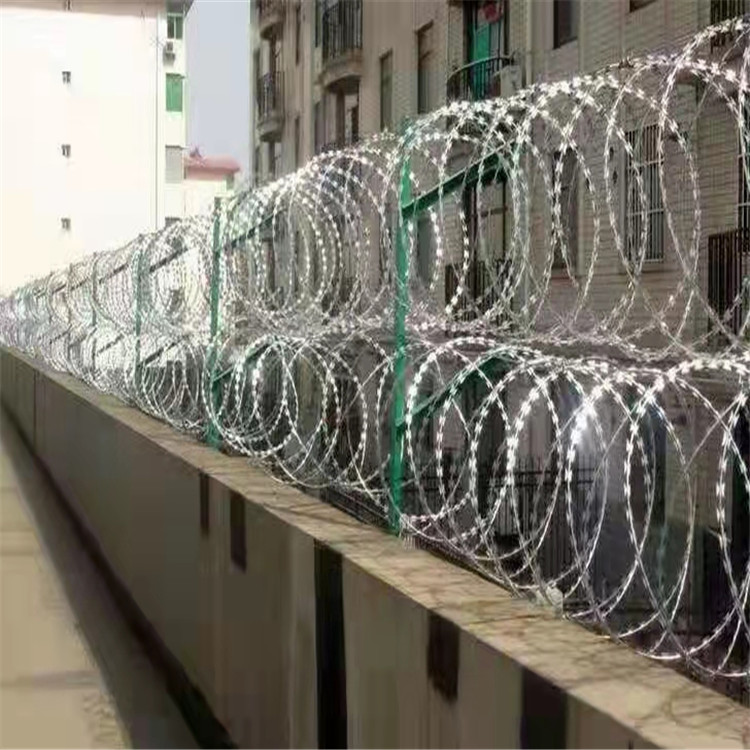 刺絲滾籠的上鋅量是有特殊要求的,現(xiàn)在市面上銷售的基本上都是每平米40-50克的上鋅量的普通產(chǎn)品,高鐵上面應(yīng)用的話一般環(huán)境選用的是120克上鋅量,特殊環(huán)境選用的是250克甚至是270克以上的產(chǎn)品,無論是板材還是里面包裹的內(nèi)絲都必須保證這個(gè)上鋅量--星宇刺繩廠15075898878。 (1)、刺絲滾籠采用刀片刺繩繞圈后相臨兩圈每隔120°用刺絲連接卡固定,張開后形成蛇腹網(wǎng)狀,閉合后刀片刺繩圈徑為50cm,張開后每交叉圈安裝間距20cm,直徑不小于45cm。(2)、刀片刺繩由沖切鋼板采用機(jī)械壓軋?jiān)阡摻z上成型,刀刺寬度22mm,兩刃垂直間距15mm,刀刺縱向間距34mm,芯絲直徑為2.5mm。刀片采用厚度0.5mm的Q195鋼板沖切制作,芯絲由HPB300?6.5mm高線鋼絲加工。(3)、刺絲滾籠由刺絲連接卡扣與固定在支架上的縱向拉筋相連接,縱向拉筋與支架的連接采用?2.5mm的冷拔鍍鋅鋼絲繞2圈后擰緊固定,支架設(shè)置在跨度3m防護(hù)柵欄的立柱和跨中位置,其他跨度僅設(shè)置與立柱上部,支架與防護(hù)柵欄采用支架抱箍連接。(4)、刺絲滾籠的下緣距離鋼筋混凝土防護(hù)柵欄上緣的垂直距離為0.05m。