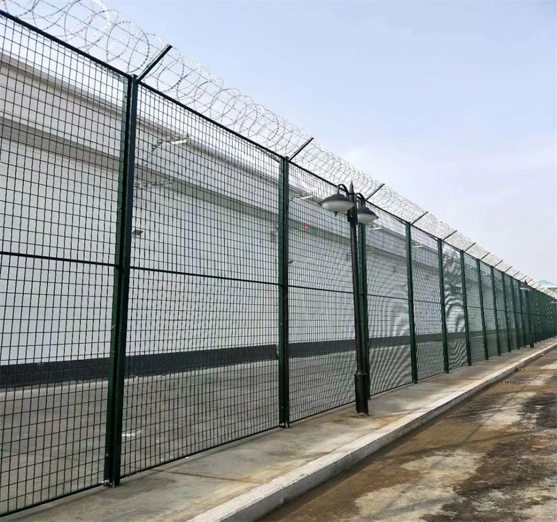 4. 鋼網(wǎng)圍墻:這種類型的監(jiān)獄鋼網(wǎng)墻使用鋼絲網(wǎng)作為圍墻的主要材料,鋼絲網(wǎng)通過焊接或綁扎在鋼管框架上。鋼網(wǎng)圍墻具有較高的透明度和通風(fēng)性,適用于需要較好的視野和通風(fēng)條件的監(jiān)獄。