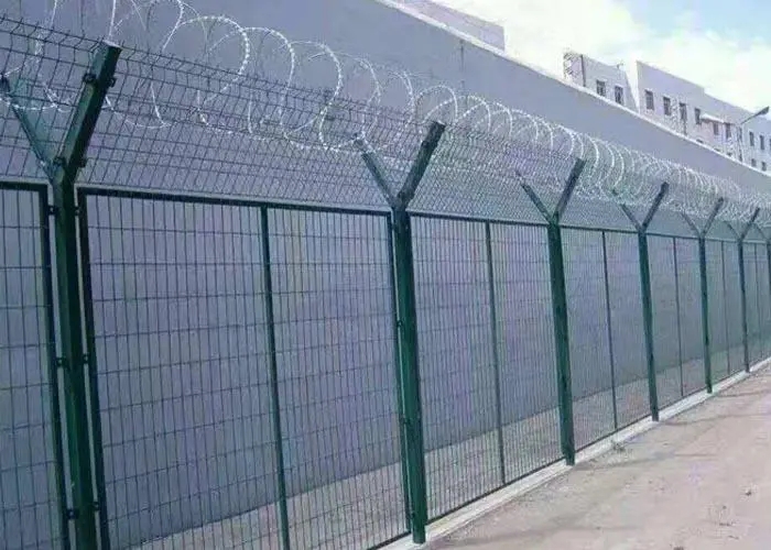 監(jiān)獄安全防護網,監(jiān)獄隔離鋼網墻,是監(jiān)獄安全防護設施。監(jiān)區(qū)看守所戒毒所內外4米高隔離網墻常用規(guī)格網墻,焊接鋼網加蛇腹形刀刺網,結構新穎、堅固緊密、網面平整、網孔均勻、刀鋒說利、防攀爬、太腐蝕性強,可以建設于監(jiān)獄的內外墻地面及高墻之上,網墻內側或頂部加裝蛇腹形刀刺網,形成一道高不可攀難以逾越的隔離障礙,達到恐嚇,防止犯人越猶逃跑的作用。煤接式刀片刺網隔離網墻,刀片采用熱鍍鋅合金鋼薄板,鋼絲采用80A熱鍍鋅鋼絲,經過機器沖壓、數控高頻排悍而成。菱形網孔:150300 mm或75-150 mm。網片邊框:20-30-1.5 mm矩形鋼管中間加一道橫向加強中撐。Y形立柱: 50*50*2.5 mm或60*60*2.5 mm方空心鋼管。立柱高度4050 mm。網片高度:2000 mm,上下兩片,網片寬度3000 mm,上面一道蛇腹型刀刺網。監(jiān)獄安全防護網-監(jiān)獄隔離鋼網墻總高度達到2500 mm。特珠規(guī)格型號可根據用戶需求定做。