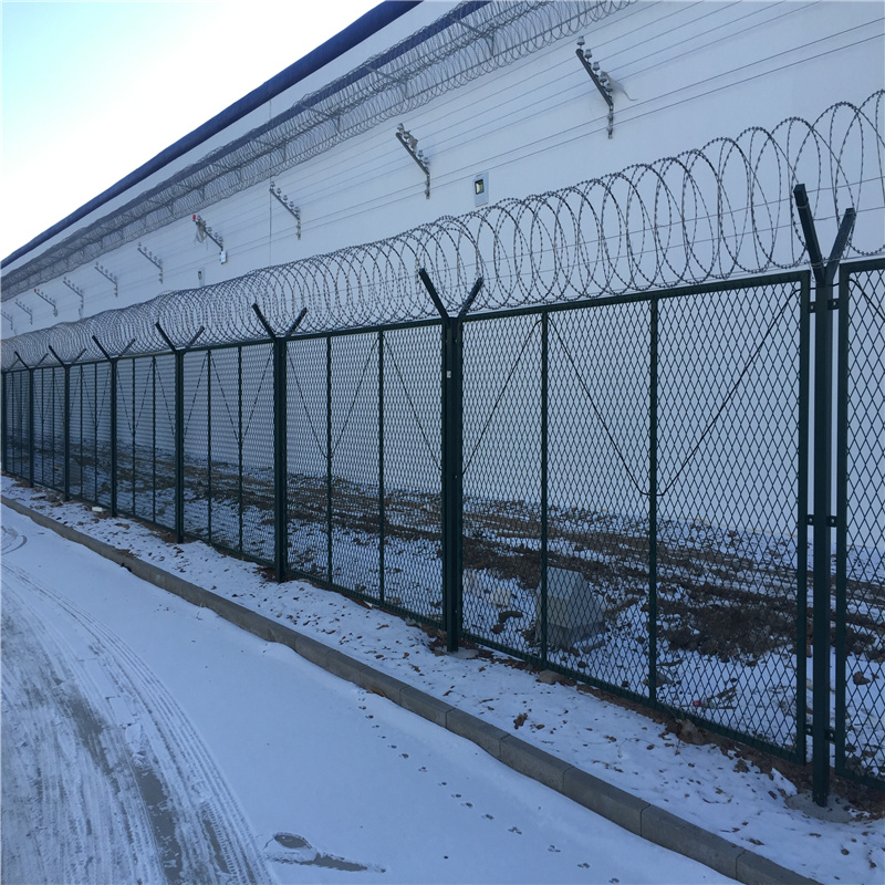 監(jiān)獄鋼網(wǎng)墻刀刺網(wǎng)片菱形孔要求豎向排列,網(wǎng)頁(yè)緊固牢靠、平整美觀,每單元網(wǎng)頁(yè)每側(cè)不少于六個(gè)連接固定點(diǎn)。蛇腹式刀刺網(wǎng)每圈刀刺間隔100mm,每米刀刺不少于10圈。刀刺網(wǎng)安裝固定卡扣整體調(diào)正,使刀刺網(wǎng)不出現(xiàn)擰轉(zhuǎn)情況,刀刺刺圈分布均勻,每隔20米與拉絲固定;分段連接處需將兩端刀刺網(wǎng)做連接固定,刀刺網(wǎng)固定點(diǎn)需緊鎖不得出現(xiàn)松動(dòng)、脫落現(xiàn)象;刀刺網(wǎng)安裝與隔離網(wǎng)平行,上下左右均成直線延伸,轉(zhuǎn)角處需做加密加固處理。