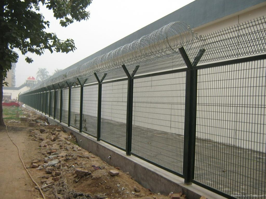 監(jiān)獄網(wǎng)墻設計要求:整體固定連貫一致,標準生產(chǎn)質(zhì)量,框網(wǎng)方正,對角線誤差不大于2cm。監(jiān)獄隔離網(wǎng)網(wǎng)面安裝離地距離5-8cm,框網(wǎng)與立柱采用螺栓固定邊耳式連接網(wǎng)頁每邊與立柱連接點不少于六處。立柱采用水泥澆灌預埋式,規(guī)格為600*600*600mm (長*寬*深),底座四角預制四個直徑25mm熱鍍鋅螺栓(每個螺栓中心為距基礎兩邊150mm的交叉點),從頂端往下絲長不小于150mm (與地籠焊為一體),螺栓高于底座平面50mm (底座平面應與所在位置最終地面高度在同一水平高度),螺栓間距為300mm*300mm,與立柱法蘭盤螺孔相適應。立柱保持豎直、不歪斜。立柱做調(diào)直處理,每20米校正,每100米偏差角度不大于5°,安裝整體無歪斜,隔離網(wǎng)整體呈直線(除地形需要做出適宜角度外)。
