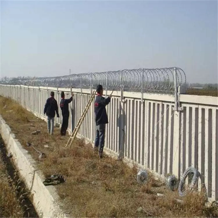 4、鐵路水泥柵欄刺絲滾籠的下緣距離鋼筋混凝土防護柵欄上緣的垂直距離為5cm,特別注意錯臺單元地段的防護柵欄刺絲滾籠的下緣距離防護柵欄上緣的垂直距離為5cm,最大距離不能超過10cm。