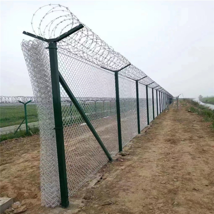 鋁包鋼機(jī)場圍界主要用于機(jī)場外圍的防護(hù)使用,是一種新型機(jī)場圍界防護(hù)網(wǎng),又被稱作鋁包鋼機(jī)場圍欄。鋁包鋼絲機(jī)場護(hù)欄具有獨(dú)具匠心的鋼絞線穿插式連接立柱和網(wǎng)片,由Y型立柱、鋁包鋼勾花網(wǎng)、鋁包鋼刺絲網(wǎng)組成。 鋁包鋼機(jī)場圍界具有美觀實(shí)用、防腐性好、無需保養(yǎng)、防攀爬能力強(qiáng)、方便運(yùn)輸和安裝等特點(diǎn),關(guān)鍵的是鋁包鋼絲機(jī)場護(hù)欄可以使用15年以上,強(qiáng)度可達(dá)600Mpa。主要適用于機(jī)場周圍的隔離防護(hù),美化及防翻越工程,目前基本都是定制生產(chǎn)