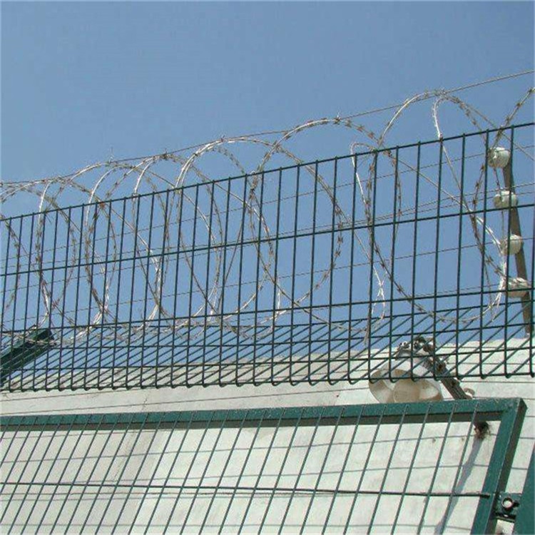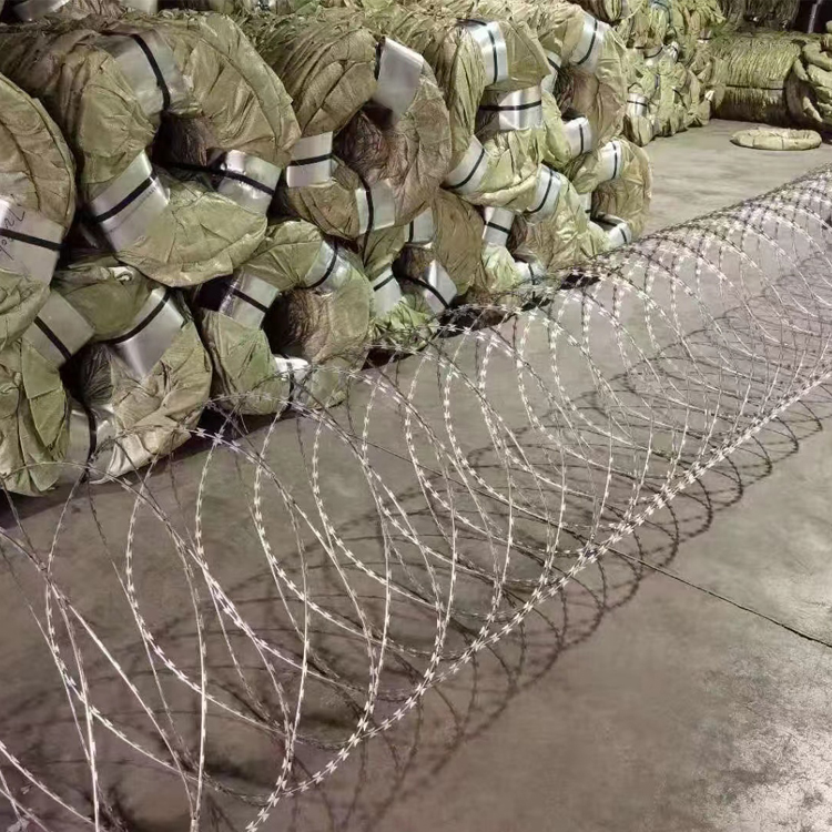 監(jiān)獄304不銹鋼防爬網(wǎng)用的不銹鋼蛇腹型刀刺網(wǎng)-般 304材質(zhì)的,防腐壽命長,不用像熱鍍鋅刀刺網(wǎng)需要勤更換的麻煩了。不銹鋼刀刺網(wǎng)直徑,常用500mm,600mm, 排列密度不小于10圈 /m,相鄰每圈間距不大于100mm;刀刺網(wǎng)刀片為304不銹鋼板沖壓的尖銳菱形,長度22mm,寬度1 5rm,厚度0.5mm;芯線為不銹鋼絲,線徑不小于2. 5mm,刀剌網(wǎng)與V型托架采用3道固定拉絲均勻固定,,扎絲采用1.2m304不銹鋼絲,固定拉絲采用8號(hào)鍍鋅鐵。