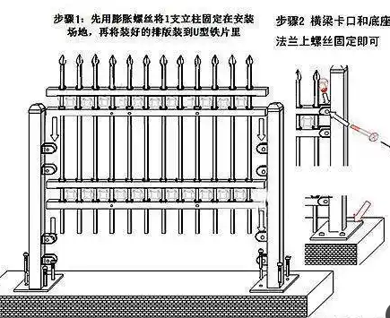 想要了解場地圍墻專用的鋅鋼護欄怎么安裝,就要先了解現(xiàn)在消費者在購買圍墻用鋅鋼護欄時最青睞哪一種,通過我們這么多年的鋅鋼護欄銷售經(jīng)驗可以看出,現(xiàn)在熱鍍鋅方管制作而成的鋅鋼護欄最被消費者青睞,這種被稱作鋅鋼護欄或鋅鋼圍墻護欄的產(chǎn)品,是由不同規(guī)格的熱鍍鋅方管拼接而成,整個制作過程中不需要焊接,這種鋅鋼護欄最常用的材料:橫桿:40*40mm熱鍍鋅方管; 豎桿19*19mm熱鍍鋅方管; 立柱:50*50mm熱鍍鋅方管,生產(chǎn)這種鋅鋼圍墻護欄時,只需要按照豎桿的規(guī)格尺寸在橫桿上開出合適的方孔,安裝時直接把豎桿插入橫桿上所開的空中。具體的組裝步驟如下圖所示